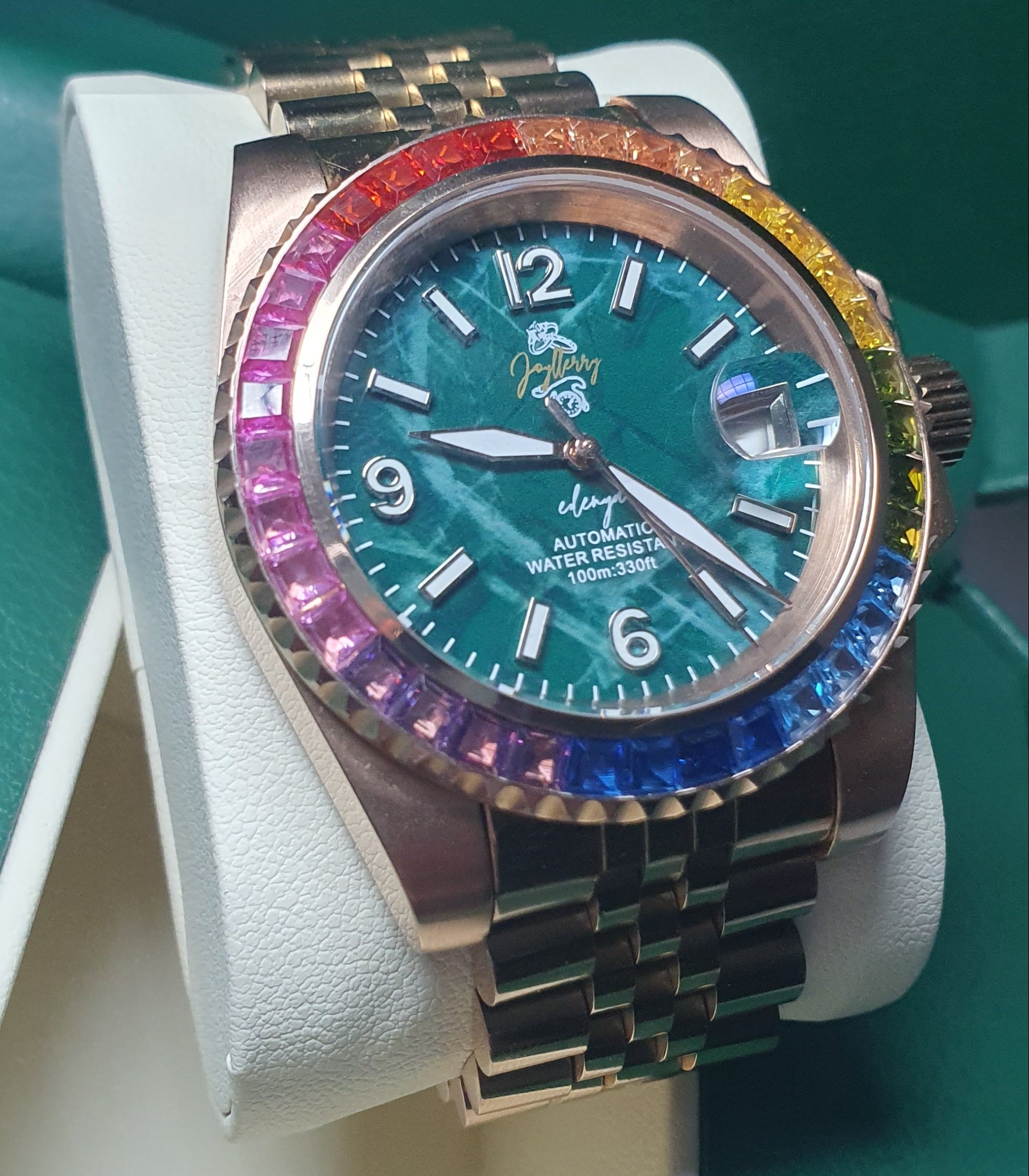 Audacieuse et précieuse, Edenya se distingue par son boîtier rose gold et sa lunette ornée de diamants aux reflets arc-en-ciel. Chaque détail a été conçu pour capter la lumière et sublimer le temps. Edenya est une création d’exception, destinée à celles qui recherchent une montre joaillière au caractère unique et contemporain.