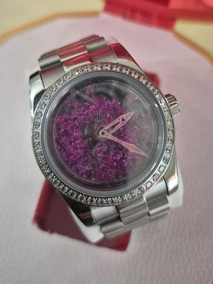 Élégante et lumineuse, Wendy séduit par son boîtier argenté sublimé de rubis. Son cadran révèle une profondeur unique, où la matière et la lumière dialoguent avec finesse. Pensée comme un bijou horloger, Wendy incarne une féminité affirmée, raffinée et intemporelle.